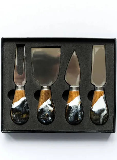 These beautiful 4-piece sets are made from high quality stainless steel and come with a solid wood handle. Our in-house artists then accent the handles with a gorgeous eco-friendly resin in eight distinct color patterns. Each knife is a unique work of art and no two are exactly the same!